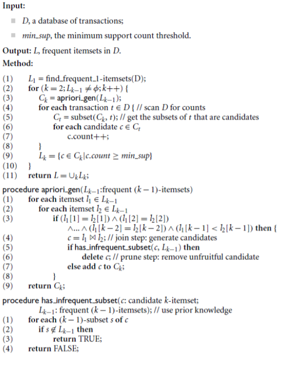 이런 식으로 k가 아이템 셋의 전체 숫자가 될 때까지 혹은 L_k가 공집합이 될 때까지 계속 진행하면 된다. 이 과정을 통해 만들어진 L 집합에 속한 모든 itemset들이 minimum support를 만족하는 itemset이 된다.