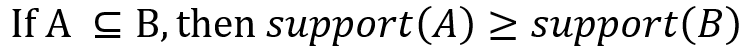 이를 association rule로 적용시켜 보자. 만약 A가 B의 부분집합이라면, A의 support는 B의 support보다 크거나 같을 것이다. 이를 식으로 표현하면 다음과 같다.