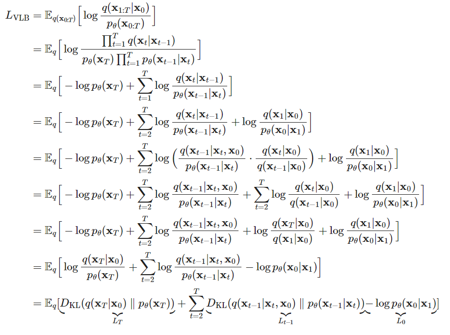 - $L_T$: p가 generate하는 noise $x_T$와 q가 $x_0$라는 데이터가 주어졌을 때 generate하는 noise $x_T$ 간의 분포 차이